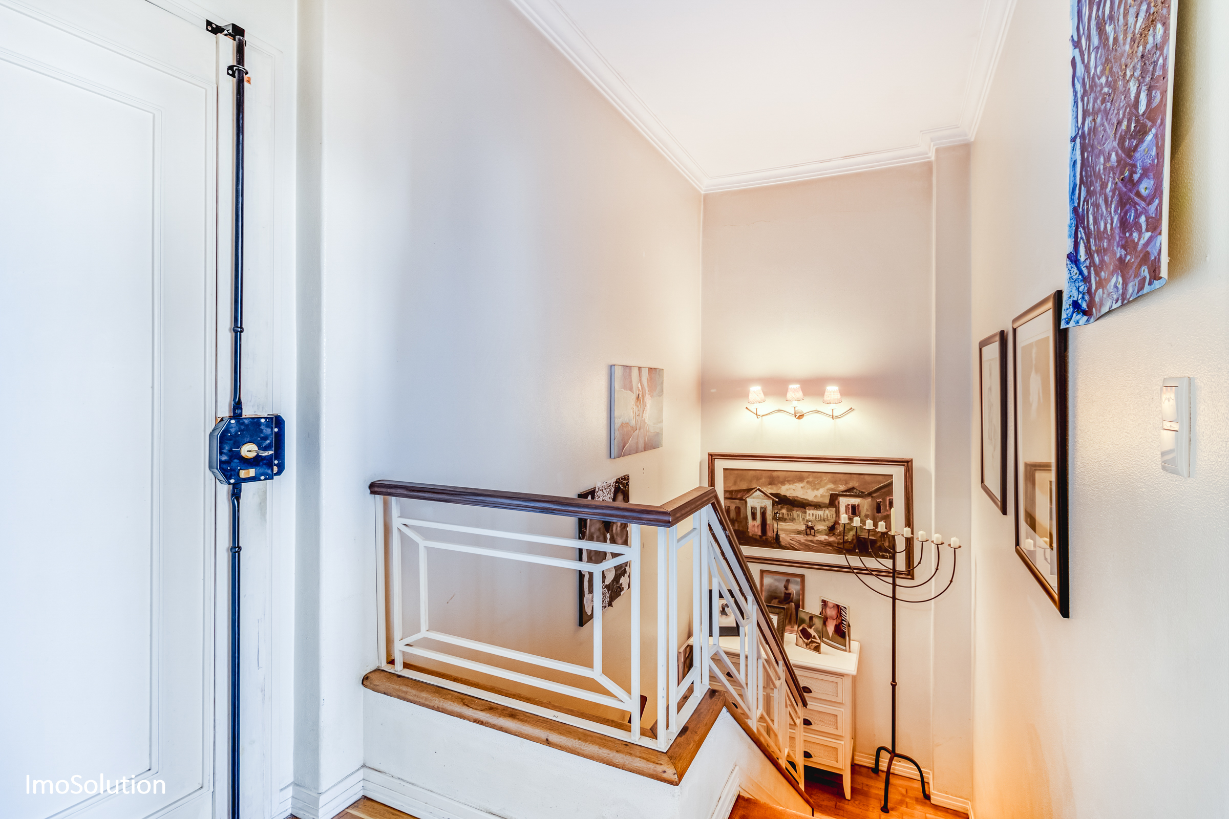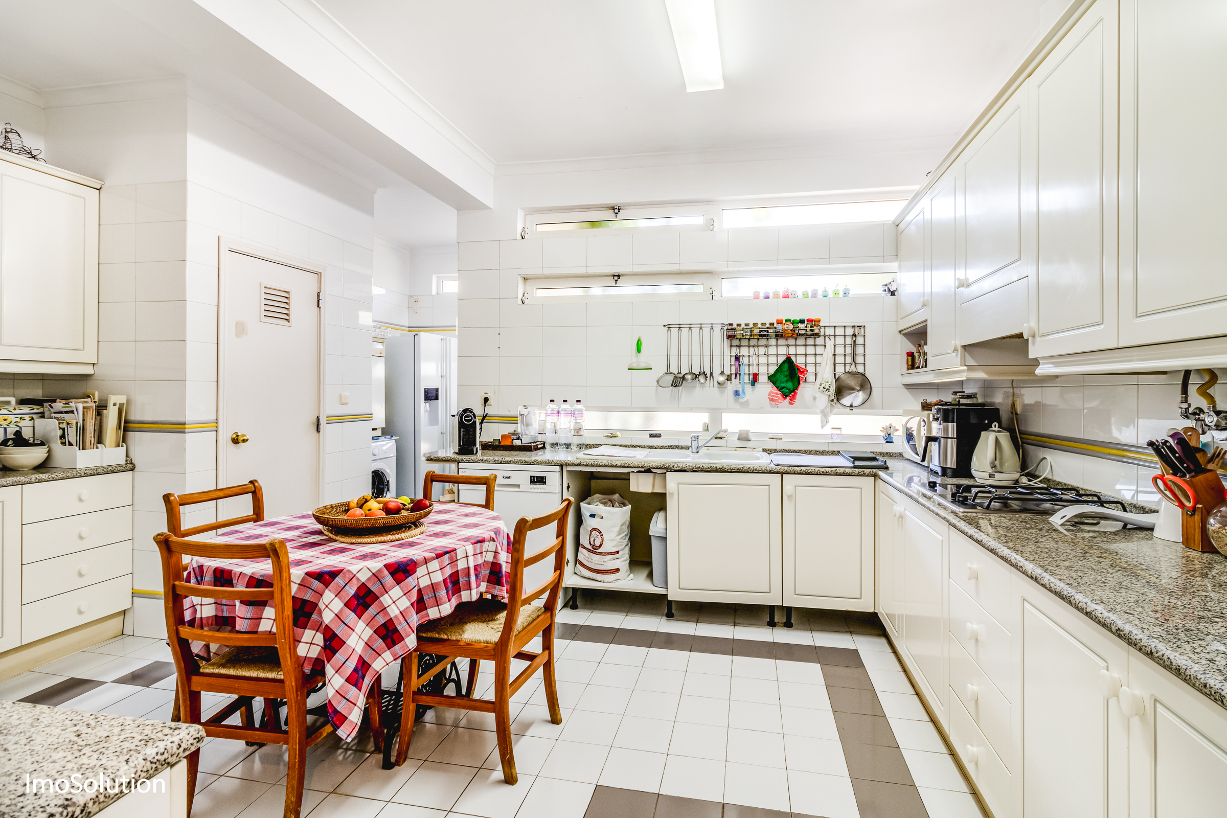 Já na fração, mas ainda em zona exterior, encontramos um jardim com logradouro principal (ideal para estacionar um carro), acesso à garagem do apartamento e à entrada principal. No interior, o piso de entrada é composto por hall, I. S. de serviço, ampla cozinha, salão de estar e jantar com lareira e acesso a um magnífico terraço com vista desafogada e de mar, temos ainda uma zona de distribuição onde se encontra a caixa de escada para o piso inferior e também o acesso à garagem.