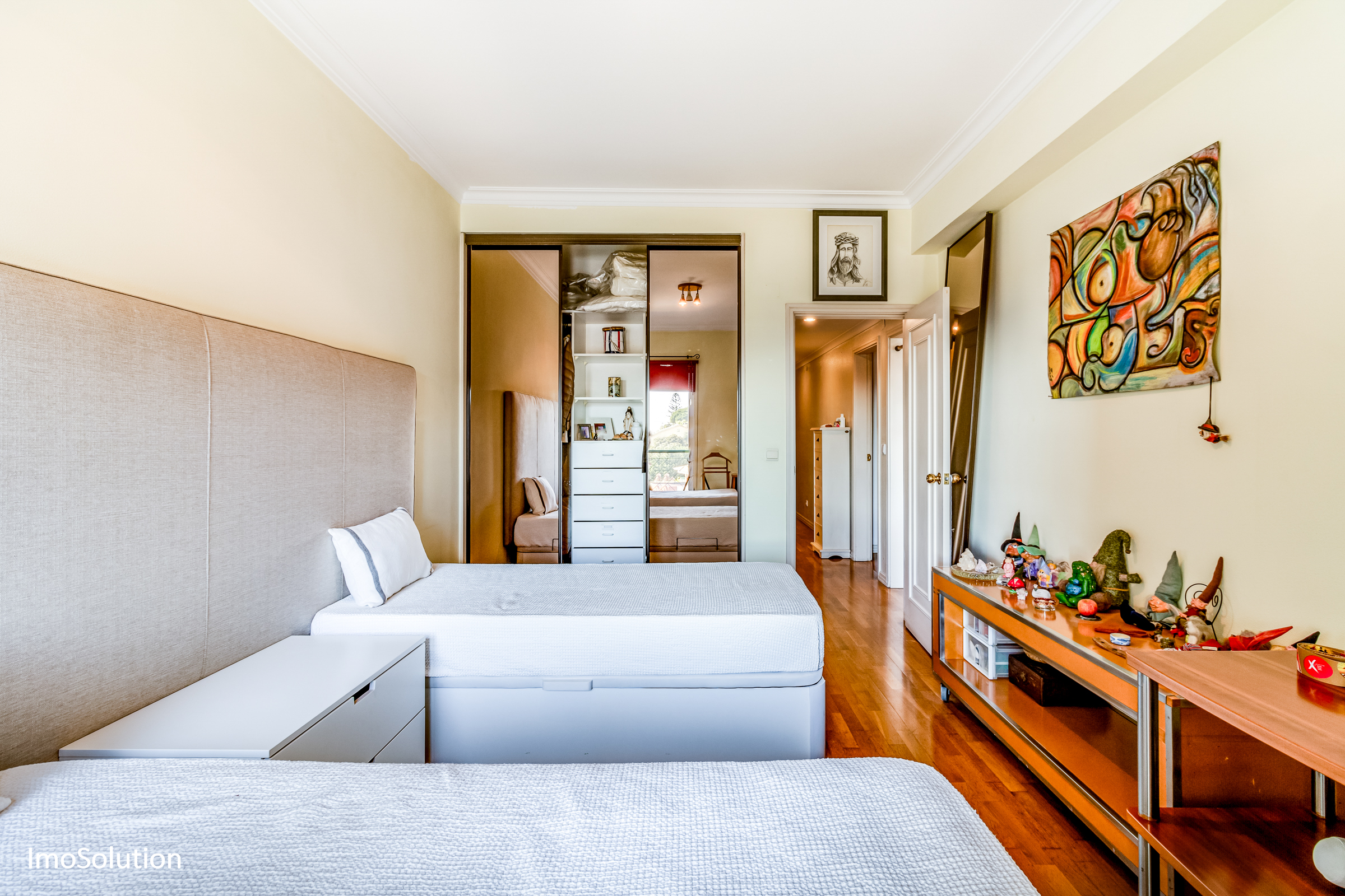 On the lower floor, the apartment has 3 bedrooms, one of them en suite, all with fitted wardrobes, a large full bathroom serving the other two bedrooms, a distribution area with storage space, and access to the building’s staircase, which leads to the interior of the condominium, where residents can enjoy common areas, namely the swimming pool, gym, and sauna.